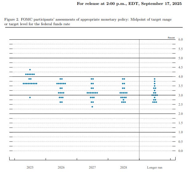 The interesting thing is that Miran didn’t even appear to try to hide his outside influenced approach. When you see the dot plot there is one new dot that was not there in June that is 75 basis points below every other dot on the plot expecting another 125 basis points in cuts at the final two meetings of the year. The dot plot is anonymous so we don’t know whose dot that is, but very few people have much doubt.